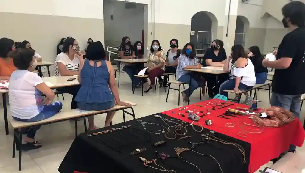 Pessoas em situação de vulnerabilidade social atendidas por entidades assistenciais participam de oficinas onde aprendem a confeccionar biojoias a partir de materiais naturais e recicláveise com incentivo a geração de renda.